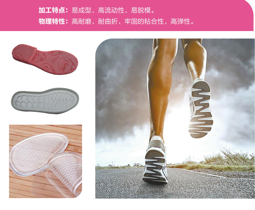 TPE/TPR鞋底材料一般是SEBS與SBS基礎分別與其它混合物共混改性的一種熱塑性彈性體材料,經過擠出,注射,模壓等工藝加工后成型制成的鞋底具有防滑、耐低溫、彎曲性強、透氣性好,密度小、粘接強度牢等優點,而且廢料,邊料可以回收再生。因此,TPE/TPR鞋底材料很快在制鞋工業中得到重視并迅速發展。