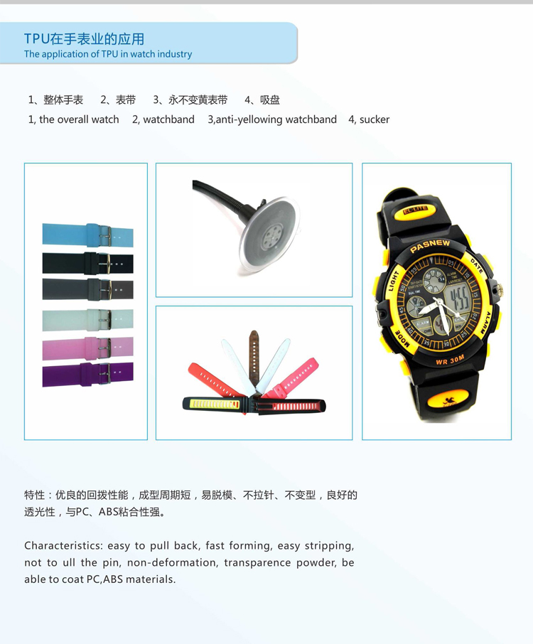 產品描述:TPU在手表行業(yè)的應用:1.整體手表2.表帶3.永不變黃表帶4.吸盤TPU手表產品的特性:優(yōu)良的回撥性能,成型周期短,易脫模,不拉針,不變型,良好的透光性,與PC、ABS粘合性強。