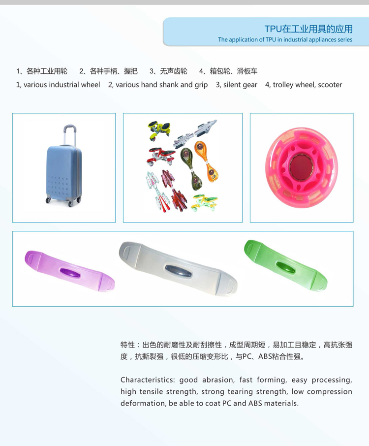 產品描述:TPU在工業用具的應用:1.各種工業用輪2.各種手柄、握把3.無聲齒輪4.箱包輪、滑板車TPU工業產品的特性:出色的耐磨性及耐刮擦性,成型周期短,易加工具穩定,高抗張強度,抗撕裂強,很低的壓縮變形比,與PC、ABS粘合性強。