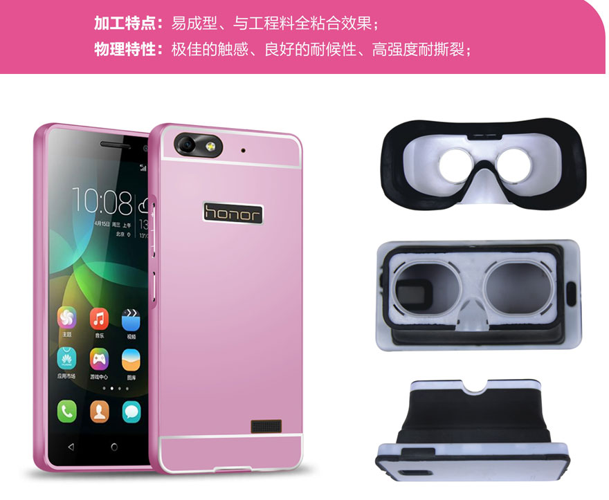 本公司開發的智能穿戴TPE原料系列材料,可用于生產智能手環,手機保護套等產品。該系列TPE材料具有類似硅膠的爽滑手感,與皮膚接觸無刺激性,耐臟耐汗液,耐油污,表面耐刮花性好,彈性優良。